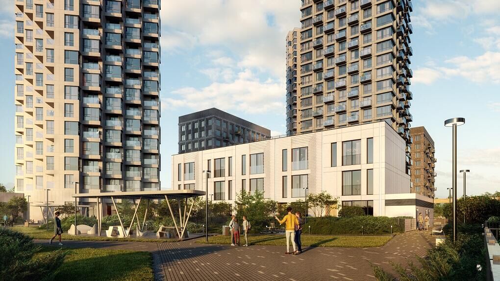 Как добавляется в нем, прилегающая территория благоустроена: высажены деревья и кустарники, установлены скамейки и детский игровой комплекс. Ключевые функциональные зоны соединены сетью пешеходных дорожек. Ранее также были обустроены променад и игровой велопешеходный бульвар для жителей и гостей квартала.